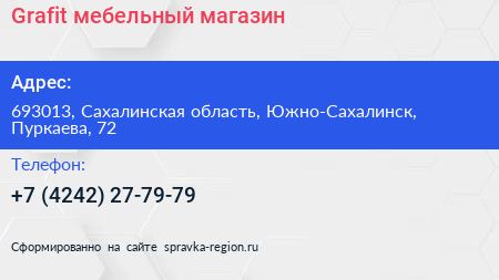 Grafit, мебельный магазин по адресу 693013, Сахалинская область, Южно-Сахалинск, Пуркаева, 72 в дальнейшем Организация, размещена в следующих категориях: