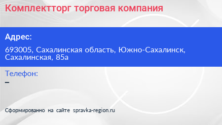 Комплектторг, торговая компания по адресу 693005, Сахалинская область, Южно-Сахалинск, Сахалинская, 85а в дальнейшем Организация, размещена в следующих категориях: