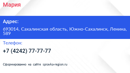 Мария по адресу 693014, Сахалинская область, Южно-Сахалинск, Ленина, 589 в дальнейшем Организация, размещена в следующих категориях: