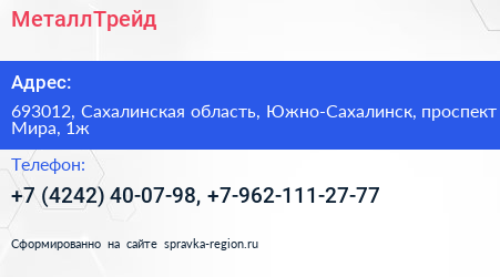 МеталлТрейд по адресу 693012, Сахалинская область, Южно-Сахалинск, проспект Мира, 1ж в дальнейшем Организация, размещена в следующих категориях: