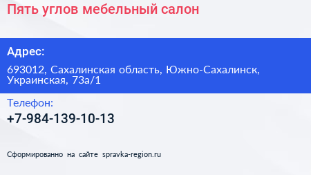 Пять углов, мебельный салон по адресу 693012, Сахалинская область, Южно-Сахалинск, Украинская, 73а/1 в дальнейшем Организация, размещена в следующих категориях: