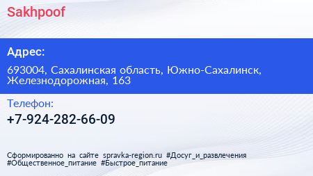 Sakhpoof по адресу 693004, Сахалинская область, Южно-Сахалинск, Железнодорожная, 163 в дальнейшем Организация, размещена в следующих категориях: