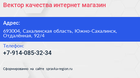 Вектор качества, интернет-магазин по адресу 693004, Сахалинская область, Южно-Сахалинск, Отдалённая, 92/4 в дальнейшем Организация, размещена в следующих категориях: