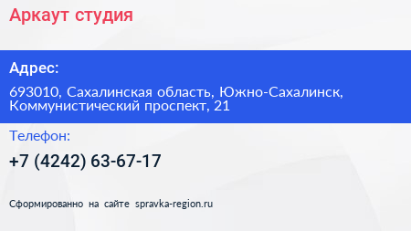Аркаут, студия по адресу 693010, Сахалинская область, Южно-Сахалинск, Коммунистический проспект, 21 в дальнейшем Организация, размещена в следующих категориях: