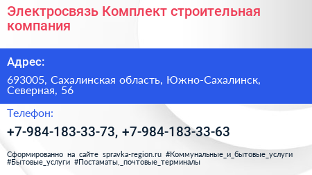 Электросвязь Комплект, строительная компания по адресу 693005, Сахалинская область, Южно-Сахалинск, Северная, 56 в дальнейшем Организация, размещена в следующих категориях: