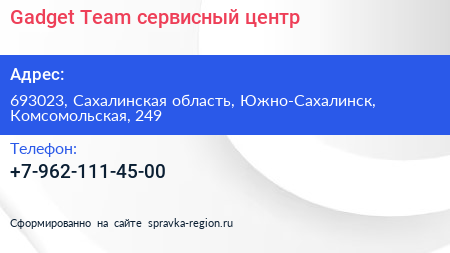 Gadget Team, сервисный центр по адресу 693023, Сахалинская область, Южно-Сахалинск, Комсомольская, 249 в дальнейшем Организация, размещена в следующих категориях: