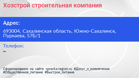 Хозстрой, строительная компания по адресу 693004, Сахалинская область, Южно-Сахалинск, Пуркаева, 57Б/1 в дальнейшем Организация, размещена в следующих категориях: