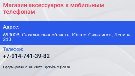 Магазин аксессуаров к мобильным телефонам по адресу 693009, Сахалинская область, Южно-Сахалинск, Ленина, 213 в дальнейшем Организация, размещена в следующих категориях: