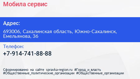 Мобила-сервис по адресу 693006, Сахалинская область, Южно-Сахалинск, Емельянова, 36 в дальнейшем Организация, размещена в следующих категориях: