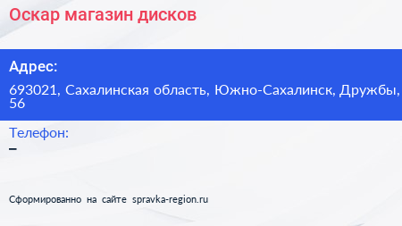 Оскар, магазин дисков по адресу 693021, Сахалинская область, Южно-Сахалинск, Дружбы, 56 в дальнейшем Организация, размещена в следующих категориях: