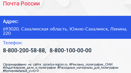 Почта России по адресу 693020, Сахалинская область, Южно-Сахалинск, Ленина, 220 в дальнейшем Организация, размещена в следующих категориях: