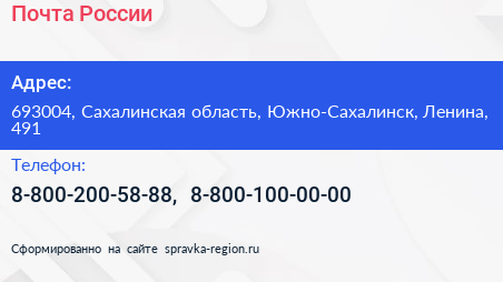 Почта России по адресу 693004, Сахалинская область, Южно-Сахалинск, Ленина, 491 в дальнейшем Организация, размещена в следующих категориях: