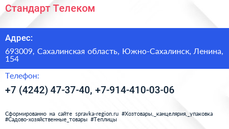 Стандарт Телеком по адресу 693009, Сахалинская область, Южно-Сахалинск, Ленина, 154 в дальнейшем Организация, размещена в следующих категориях: