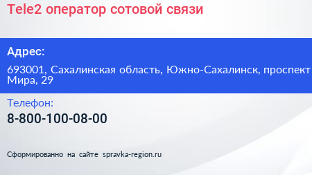 Tele2, оператор сотовой связи по адресу 693001, Сахалинская область, Южно-Сахалинск, проспект Мира, 29 в дальнейшем Организация, размещена в следующих категориях: