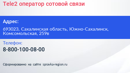 Tele2, оператор сотовой связи по адресу 693023, Сахалинская область, Южно-Сахалинск, Комсомольская, 259в в дальнейшем Организация, размещена в следующих категориях: