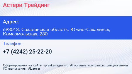 Астери Трейдинг по адресу 693013, Сахалинская область, Южно-Сахалинск, Комсомольская, 280 в дальнейшем Организация, размещена в следующих категориях: