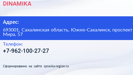 DINAMIKA по адресу 693001, Сахалинская область, Южно-Сахалинск, проспект Мира, 57 в дальнейшем Организация, размещена в следующих категориях: