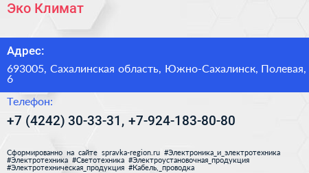 Эко Климат по адресу 693005, Сахалинская область, Южно-Сахалинск, Полевая, 6 в дальнейшем Организация, размещена в следующих категориях: