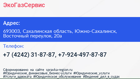 ЭкоГазСервис по адресу 693003, Сахалинская область, Южно-Сахалинск, Восточный переулок, 20а в дальнейшем Организация, размещена в следующих категориях: