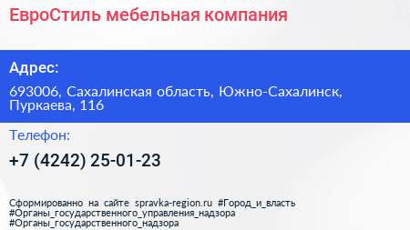 ЕвроСтиль, мебельная компания по адресу 693006, Сахалинская область, Южно-Сахалинск, Пуркаева, 116 в дальнейшем Организация, размещена в следующих категориях: