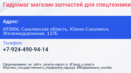 Гидромаг, магазин запчастей для спецтехники по адресу 693006, Сахалинская область, Южно-Сахалинск, Железнодорожная, 137Б в дальнейшем Организация, размещена в следующих категориях: