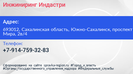 Инжиниринг Индастри по адресу 693012, Сахалинская область, Южно-Сахалинск, проспект Мира, 2в/4 в дальнейшем Организация, размещена в следующих категориях: