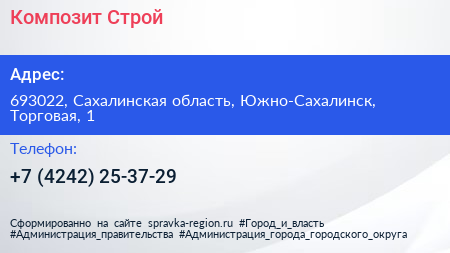 Композит Строй по адресу 693022, Сахалинская область, Южно-Сахалинск, Торговая, 1 в дальнейшем Организация, размещена в следующих категориях: