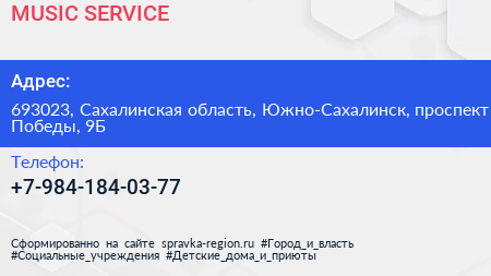 MUSIC SERVICE по адресу 693023, Сахалинская область, Южно-Сахалинск, проспект Победы, 9Б в дальнейшем Организация, размещена в следующих категориях: