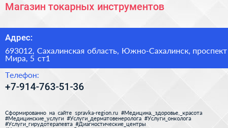 Магазин токарных инструментов по адресу 693012, Сахалинская область, Южно-Сахалинск, проспект Мира, 5 ст1 в дальнейшем Организация, размещена в следующих категориях: