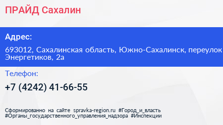 ПРАЙД Сахалин по адресу 693012, Сахалинская область, Южно-Сахалинск, переулок Энергетиков, 2а в дальнейшем Организация, размещена в следующих категориях: