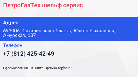 ПетроГазТех шельф-сервис по адресу 693006, Сахалинская область, Южно-Сахалинск, Амурская, 187 в дальнейшем Организация, размещена в следующих категориях: