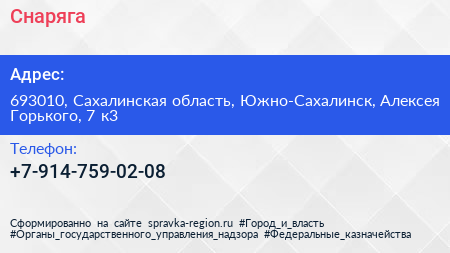Снаряга по адресу 693010, Сахалинская область, Южно-Сахалинск, Алексея Горького, 7 к3 в дальнейшем Организация, размещена в следующих категориях: