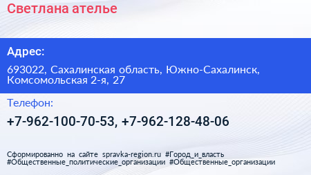 Светлана, ателье по адресу 693022, Сахалинская область, Южно-Сахалинск, Комсомольская 2-я, 27 в дальнейшем Организация, размещена в следующих категориях:
