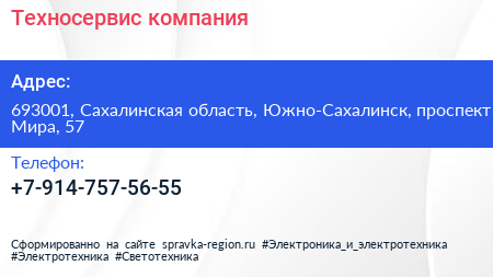 Техносервис, компания по адресу 693001, Сахалинская область, Южно-Сахалинск, проспект Мира, 57 в дальнейшем Организация, размещена в следующих категориях: