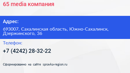 65.media, компания по адресу 693007, Сахалинская область, Южно-Сахалинск, Дзержинского, 36 в дальнейшем Организация, размещена в следующих категориях: