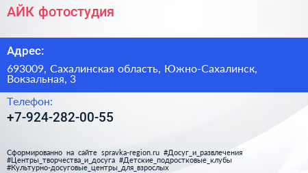 АЙК, фотостудия по адресу 693009, Сахалинская область, Южно-Сахалинск, Вокзальная, 3 в дальнейшем Организация, размещена в следующих категориях: