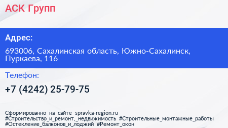 АСК Групп по адресу 693006, Сахалинская область, Южно-Сахалинск, Пуркаева, 116 в дальнейшем Организация, размещена в следующих категориях: