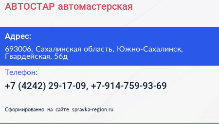 АВТОСТАР, автомастерская по адресу 693006, Сахалинская область, Южно-Сахалинск, Гвардейская, 56д в дальнейшем Организация, размещена в следующих категориях: