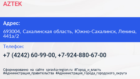 AZTEK по адресу 693004, Сахалинская область, Южно-Сахалинск, Ленина, 441а/2 в дальнейшем Организация, размещена в следующих категориях: