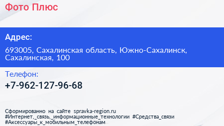 Фото Плюс по адресу 693005, Сахалинская область, Южно-Сахалинск, Сахалинская, 100 в дальнейшем Организация, размещена в следующих категориях: