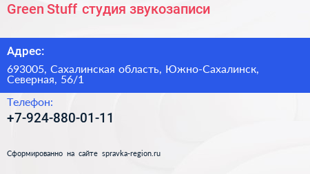 Green Stuff, студия звукозаписи по адресу 693005, Сахалинская область, Южно-Сахалинск, Северная, 56/1 в дальнейшем Организация, размещена в следующих категориях: