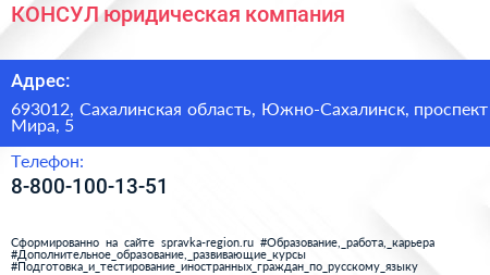 КОНСУЛ, юридическая компания по адресу 693012, Сахалинская область, Южно-Сахалинск, проспект Мира, 5 в дальнейшем Организация, размещена в следующих категориях: