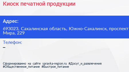 Киоск печатной продукции по адресу 693023, Сахалинская область, Южно-Сахалинск, проспект Мира, 229 в дальнейшем Организация, размещена в следующих категориях: