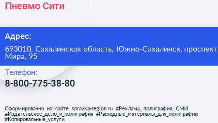 Пневмо-Сити по адресу 693010, Сахалинская область, Южно-Сахалинск, проспект Мира, 95 в дальнейшем Организация, размещена в следующих категориях:
