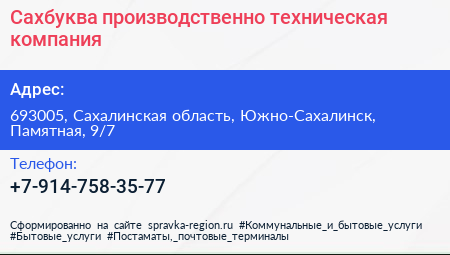 Сахбуква, производственно-техническая компания по адресу 693005, Сахалинская область, Южно-Сахалинск, Памятная, 9/7 в дальнейшем Организация, размещена в следующих категориях: