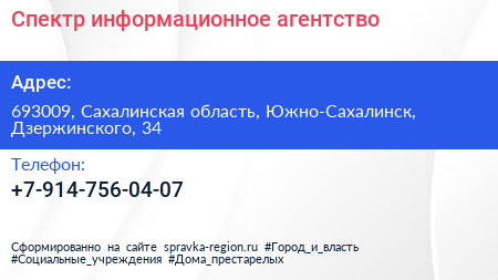 Спектр, информационное агентство по адресу 693009, Сахалинская область, Южно-Сахалинск, Дзержинского, 34 в дальнейшем Организация, размещена в следующих категориях: