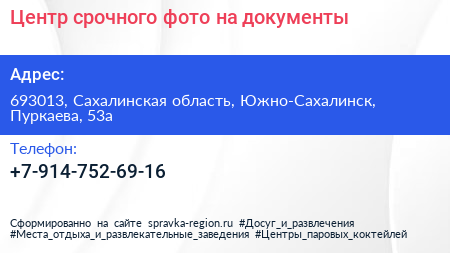 Центр срочного фото на документы по адресу 693013, Сахалинская область, Южно-Сахалинск, Пуркаева, 53а в дальнейшем Организация, размещена в следующих категориях: