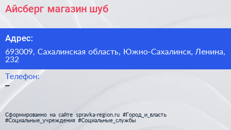 Адрес: Сахалинская область, Южно-Сахалинск, Ленина, 232