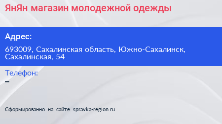 ЯнЯн, магазин молодежной одежды по адресу 693009, Сахалинская область, Южно-Сахалинск, Сахалинская, 54 в дальнейшем Организация, размещена в следующих категориях: