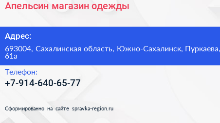Апельсин, магазин одежды по адресу 693004, Сахалинская область, Южно-Сахалинск, Пуркаева, 61а в дальнейшем Организация, размещена в следующих категориях: